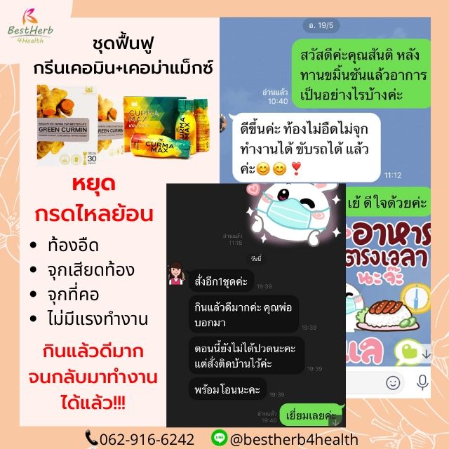สมุนไพรแก้กรดไหลย้อน ขมิ้นชันสกัด มีงานวิจัยรองรับ ลดอาการท้องอืด แน่นท้อง อาหารไม่ย่อย แสบท้อง แสบร้อนกลางอก ขมคอ จุกอก หายใจไม่สุด ดูแลได้ด้วย Green Curmin กรีนเคอมิน & Curma Max เคอม่าแม็กซ์ นวัตกรรมขมิ้นชันสกัดจากธรรมชาติผลงานวิจัยโดย ดร.ณสพน โพธิ์วิจิตร ที่ทุ่มเทวิจัยขมิ้นชันพันธุ์แดงสยามมากกว่า 25 ปี เพื่อแก้ข้อด้อยของสารสกัดเคอร์คูมินอยด์ เรื่องการทำละลายจนได้สารสำคัญ “เคอร์คูมินอยด์ ที่สามารถละลายน้ำได้ถึง 10,000 เท่า และ การคงตัวอยู่ในกระเพาะได้นานกว่า 24 ชั่วโมง” เพื่อให้ร่างกายดูดซึมนำไปใช้งานได้เต็มประสิทธิภาพ จึงแตกต่างจากขมิ้นชันทั่วไป จนได้รับการยอมรับและได้รางวัลเหรียญทองบนเวทีนานาชาติ